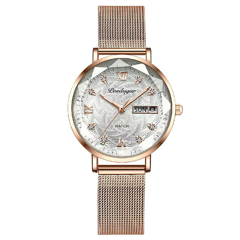 Elegáns vízálló nemesacél női karóra kör alakú fehér előlappal mesh óraszíjjal