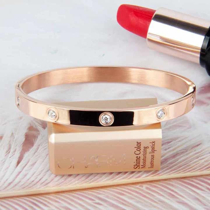 Strasszokkal díszített nemesacél karperec rozéarany színben 01